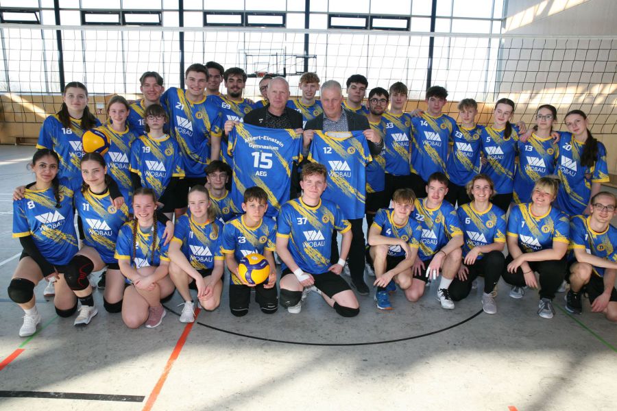 Sieben Mannschaften sind in der Volleyball-AG aktiv, darunter auch ehemalige Schülerinnen und Schüler, die ihre Leidenschaft für den Sport nicht aufgeben wollen. Nun sind sie nicht nur sportlich, sondern auch optisch bestens aufgestellt: Die Wohnungsbaugesellschaft Magdeburg (Wobau) hat der Schulmannschaft einen großen Satz blau-gelber Trikots gesponsert.